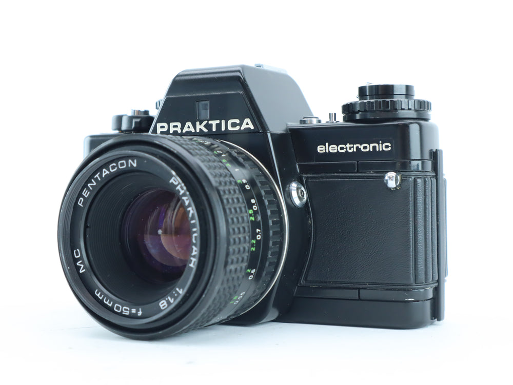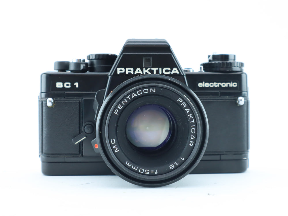 The Praktica BC1 Electronic is a reliable 35mm SLR camera made by Pentacon in the former East Germany. It offers electronic shutter control, aperture priority exposure, and an LED light meter display in the viewfinder.