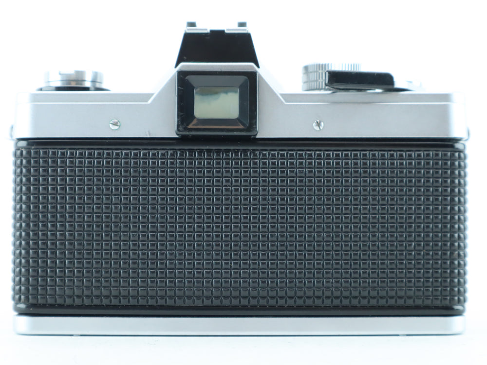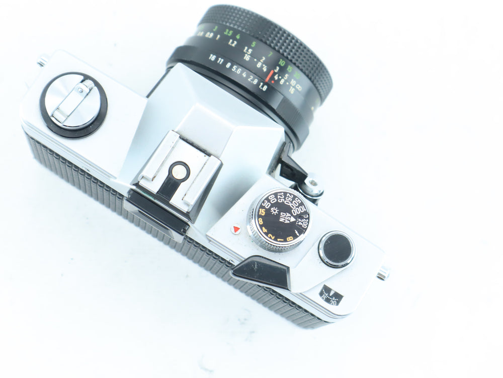 Both the camera and lens are in good working order. Shutter speeds fire accurately across the range, and the light meter responds to light (battery required). The lens is optically clean with no haze or fungus, and the focus ring turns smoothly. Aperture clicks firmly and blades are free of oil. Cosmetically, the set shows light wear consistent with age, but overall very well maintained.