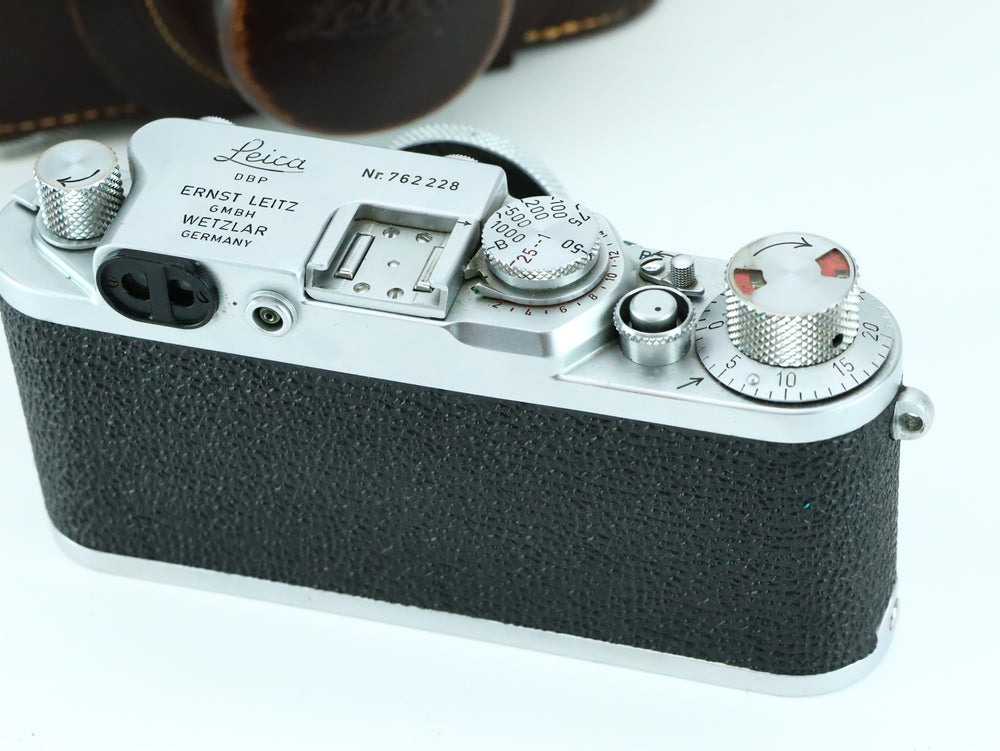 This Leica IIIf and Leitz Elmar 50mm f/3.5 lens are in exceptional condition. Very minimal cosmetic wear, mechanically perfect, with clean optics free from haze, fungus, or scratches. Rangefinder is bright and accurate. A rare example in this pristine state.