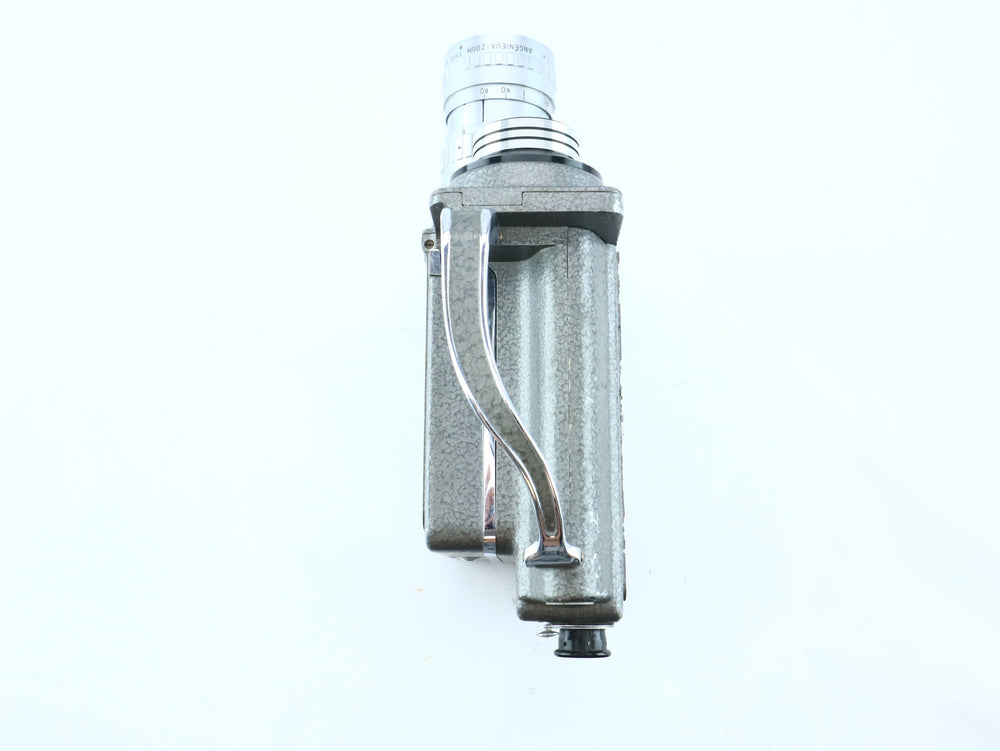 Used – Good condition. The camera shows normal cosmetic signs of use. The Angenieux lens glass is clear with no haze or fungus, and the zoom ring moves smoothly. Winding mechanism tested and functional. Not film-tested.
