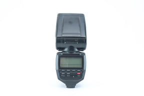 The flash shows light cosmetic wear consistent with age. The battery compartment is clean, the flash charges and fires correctly, and all buttons respond as expected. The bounce mechanism and zoom head operate smoothly.