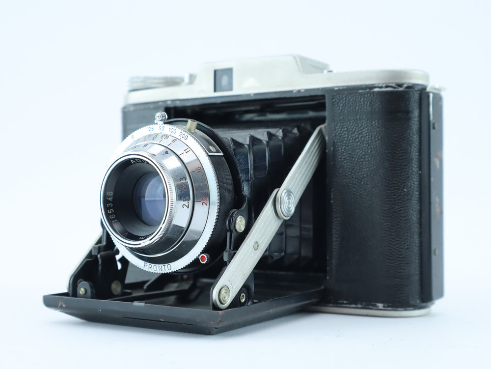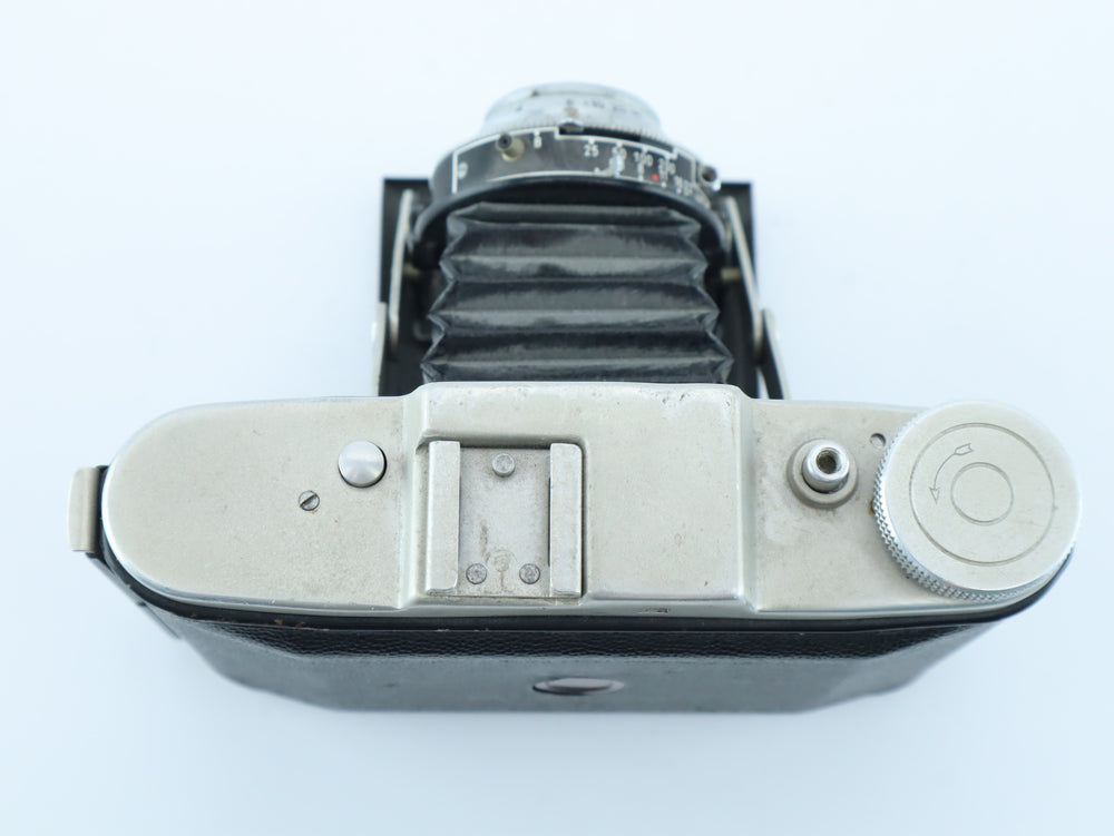 The camera shows moderate signs of use consistent with age. The bellows are intact, the shutter fires, and the lens appears clean with only minimal dust. Viewfinder is clear and usable. A great working example of this vintage model.