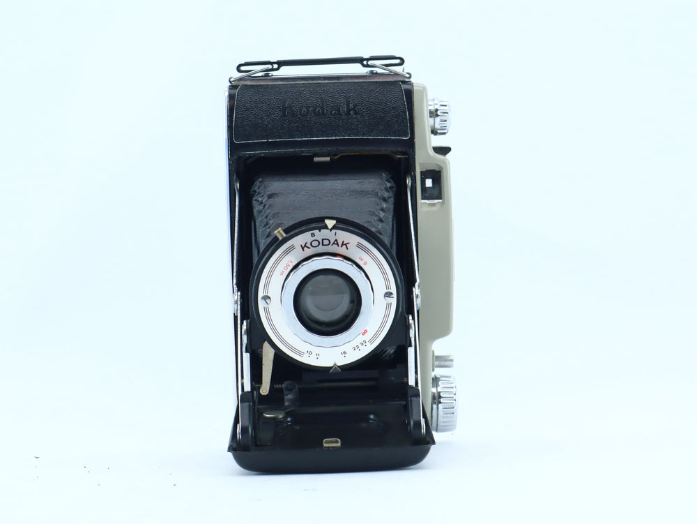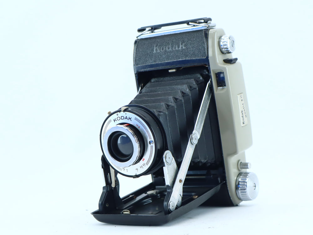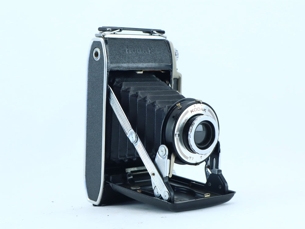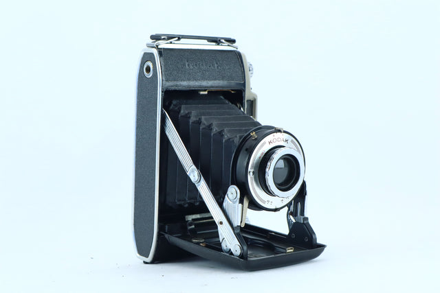 This version is equipped with a Kodak Anastigmat 6M 150mm f/6.3 lens, known for producing sharp images with pleasing bokeh, especially when stopped down. The lens is mounted in a mechanical shutter offering a range of speeds suitable for outdoor and controlled-light photography.