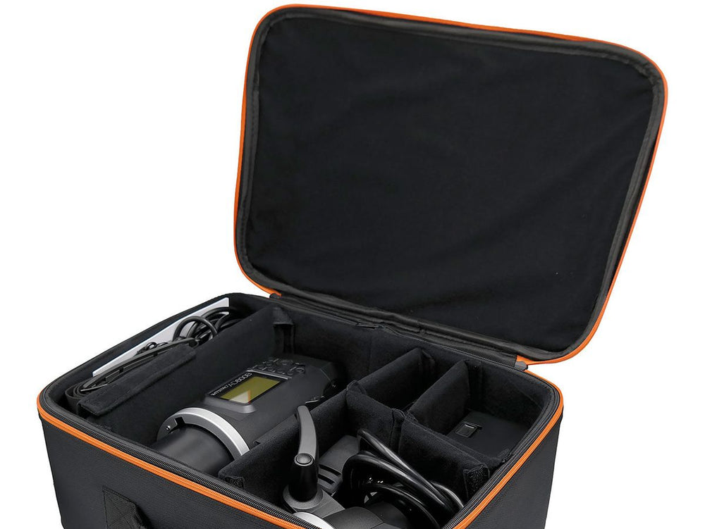 The Complete Kit for Godox AD600 Bowens TTL condenses a substantial studio flash set into a portable package for ease of transport. This comprehensive kit includes the Godox Witstro AD600B flash head, an AC adapter, an extra battery, a Godox 600Ws flash head, and a storage bag.