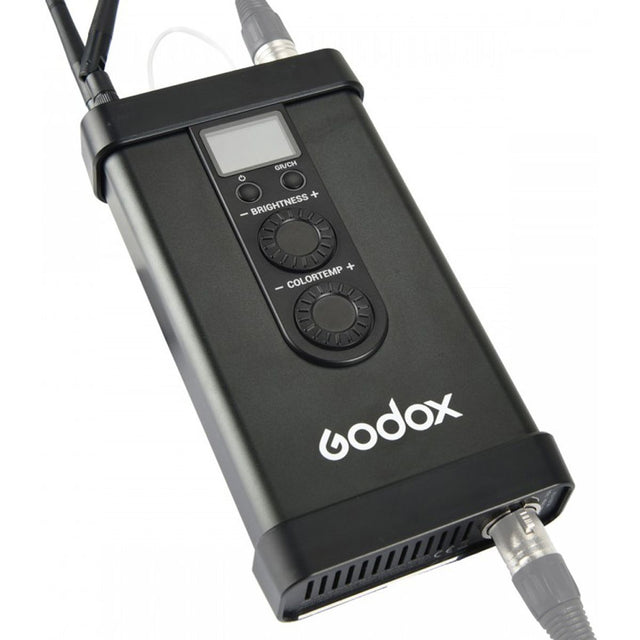 Users can easily adjust brightness, color temperature, and channel settings using the front-mounted controls. The Godox Control Panel for FL150S comes equipped with a 4-pin XLR power cable for straightforward setup. Additionally, it includes dual antennas: one for RF remote control and another for Bluetooth connectivity, allowing integration with the GodoxPhoto app on both Android and iOS devices.