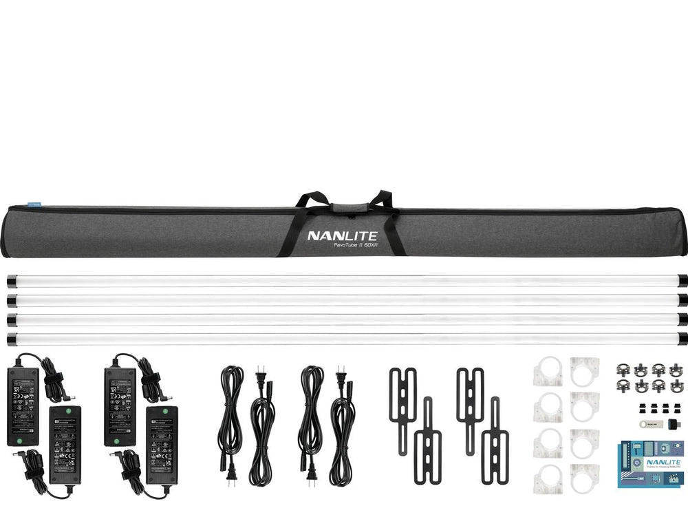 The Nanlite Pavotube II 60XR 4KIT-S is an impressive lighting kit comprising four LED tube lights designed for creative professionals. This comprehensive set comes with essential accessories and a padded carrying case for ease of transport.
