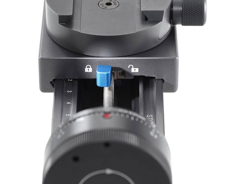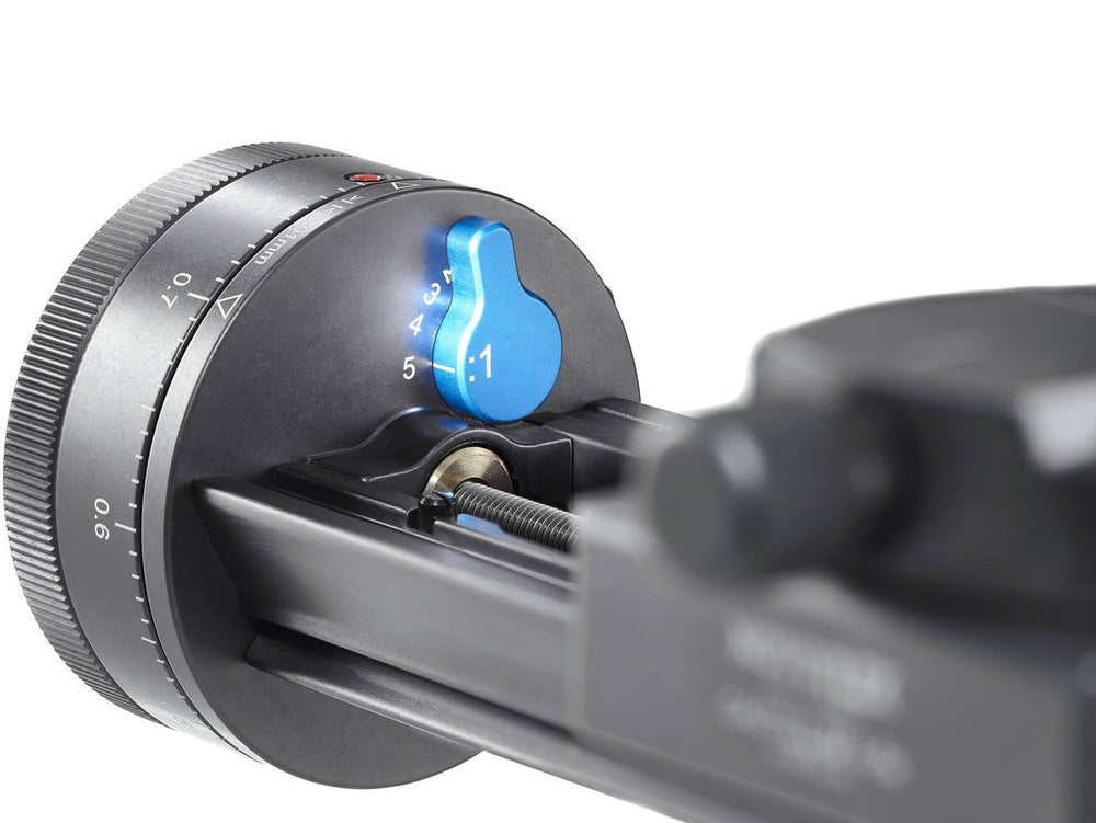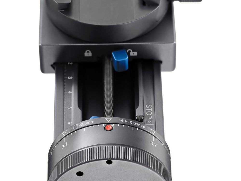 At the heart of the Castel M is a spindle that allows for highly accurate camera adjustments for each shot. It also features convenient indexing increments for magnification factors, easily adjustable via a lever located inside the cylinder on the focus wheel. Users can navigate through their series of shots with a simple click of the focus wheel, which smoothly transitions the camera to the focus point of the subsequent image. The slider intelligently calculates the step size and the necessary overlap between images. The click stops are meticulously calibrated to minimize lens diffraction effects, particularly for 35mm Full-Frame cameras set at an aperture of f/4. Cameras with smaller sensors, like APS-C, can reliably function up to 4:1, while Four-Thirds sensors are effective up to 3:1. For photographers requiring meticulous control of camera adjustments, measured and repeatable step sizes can be achieved through the laser-etched scale on the focus wheel.