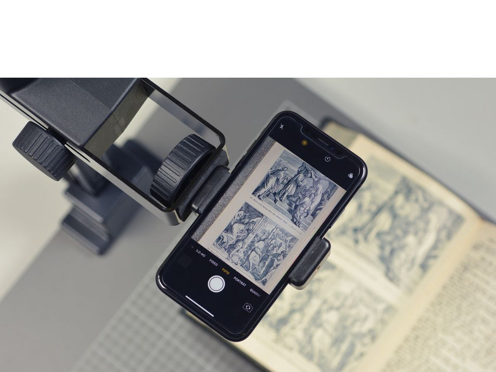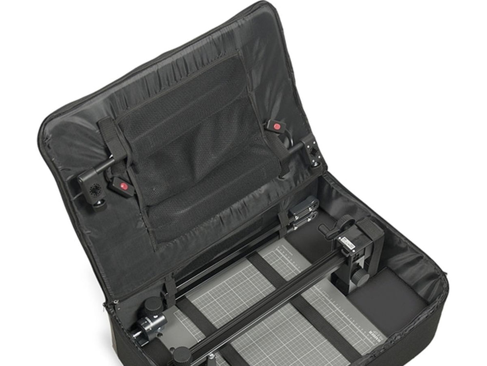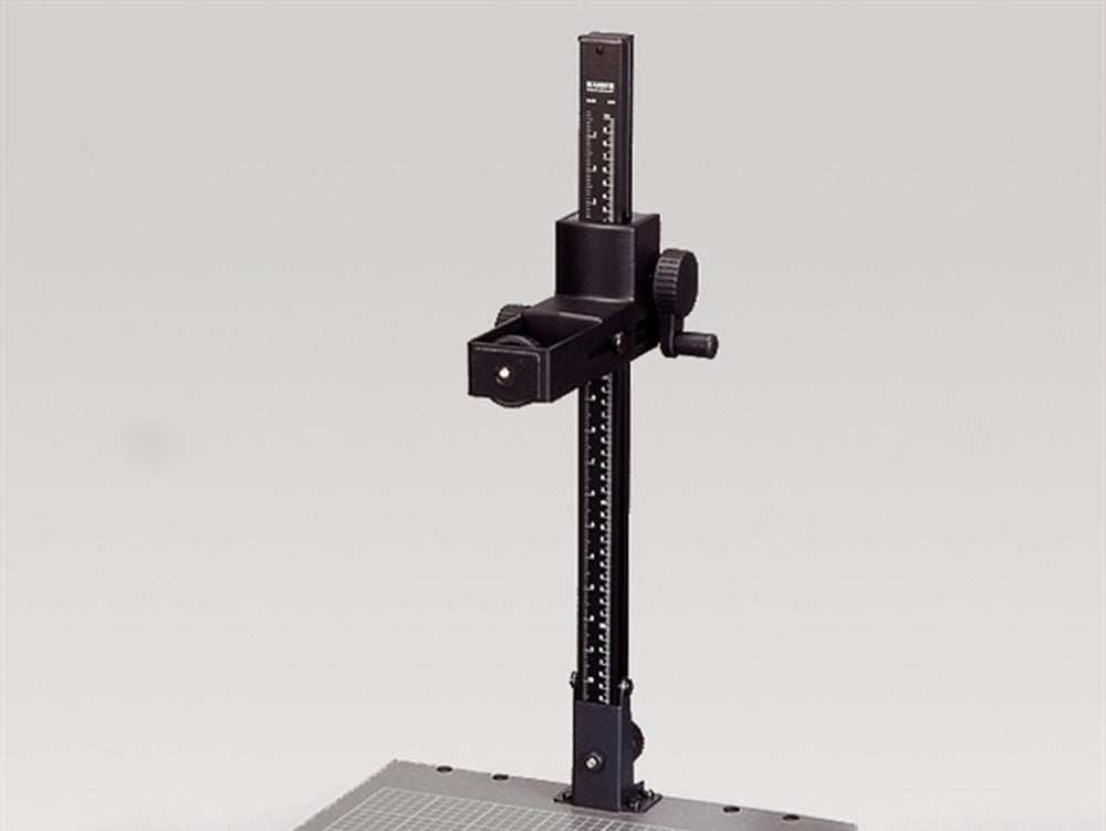 The Kaiser Camera Tripod RS 2 CP features a non-reflective, matte gray base plate that includes printed inch/cm markings for accuracy. It is designed to securely hold your camera with its sleek black aluminum mounting bracket. The tripod's innovative horizontal adjustment allows the camera to be positioned up to 7 centimeters away from the vertical axis, providing flexible shooting angles.