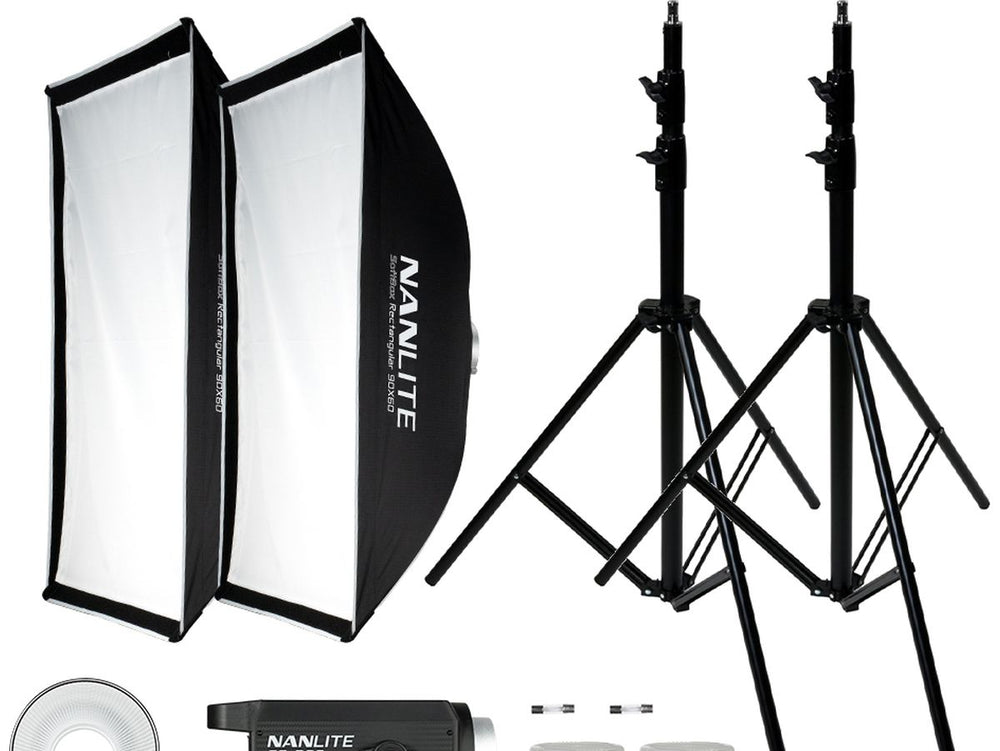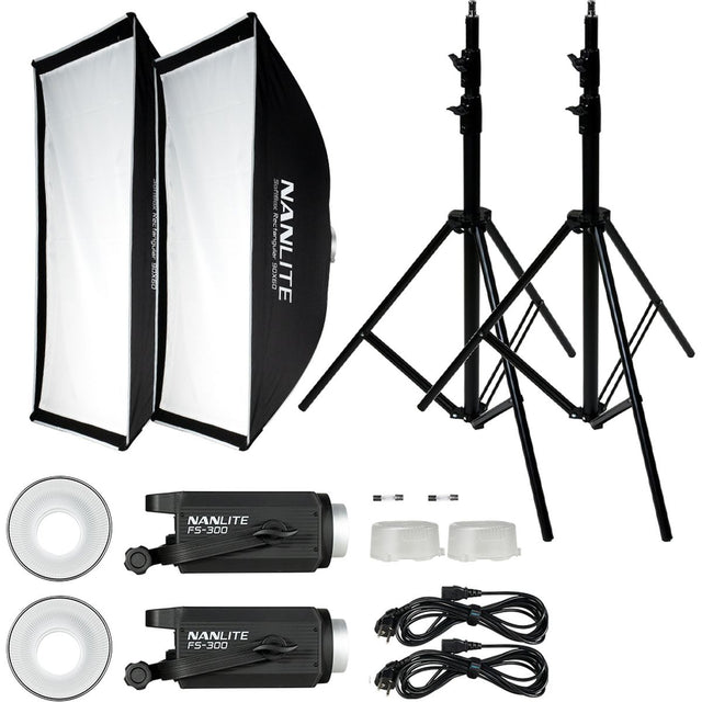 The Nanlite FS300 Dual Kit features two powerful FS-300 LED Spot Lights along with two sturdy light stands and two softboxes, perfect for versatile lighting setups.