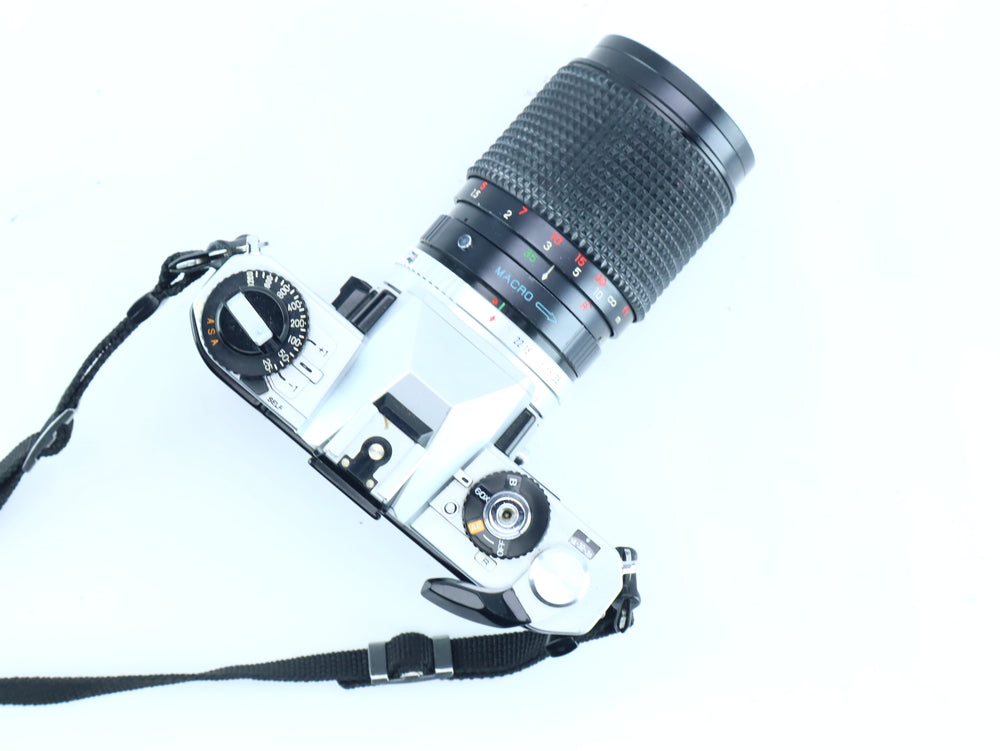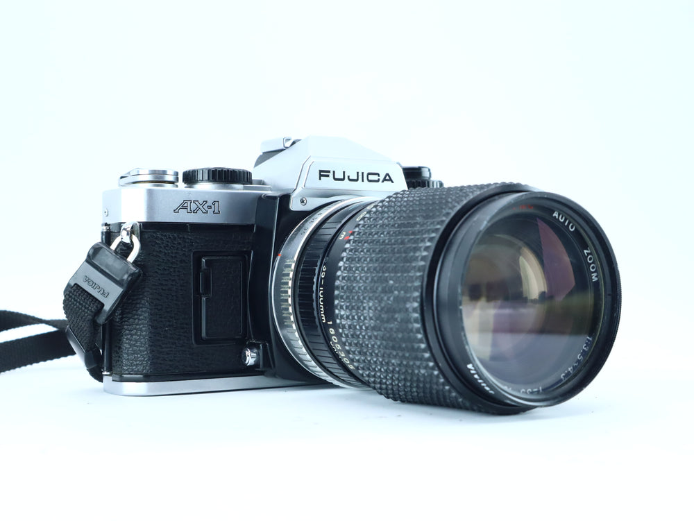 The Fujica AX-1 is a reliable and user-friendly 35mm SLR camera introduced by Fuji in the late 1970s as part of the Fujica AX series. It features aperture-priority automatic exposure and a bright viewfinder, making it easy to operate while maintaining precise control. Paired with the versatile Panagor-E PMC 35–100mm f/3.5–4.3 zoom lens, this kit offers great flexibility for everyday shooting, from landscapes to portraits.