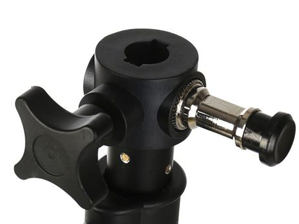 It features a universal spigot adapter on top, which accommodates all standard studio equipment. This convenient light stand is divided into three sections. Atop the spigot adapter, there is a 1/4 inch male thread. The universal light stand has a leg spread of 100cm and weighs a feather-light 2.3kg for efficient portability.