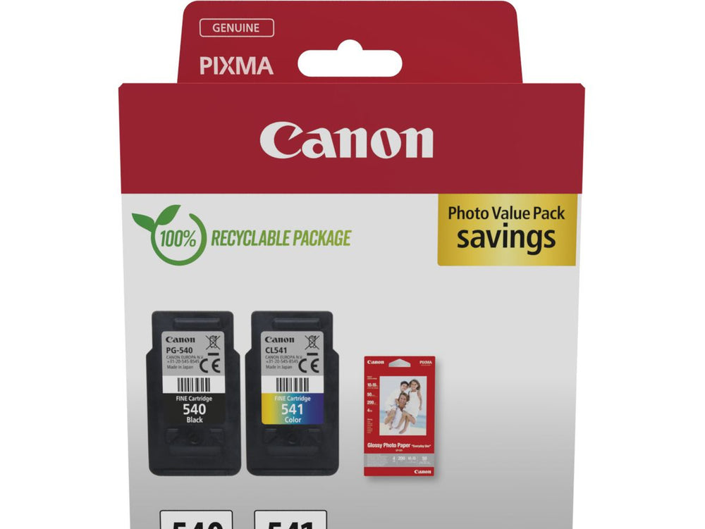 The Canon PG-540/CL-541 PVP Ink Cartridges consists of a PG-540 black ink cartridge and a CL-541 color ink cartridge. The black pigment ink, suitable for printing text documents on regular paper, delivers sharp, clear text prints that maintain their quality over time. With the 8 ml PG-540 cartridge, it allows up to 180 A4-page prints.