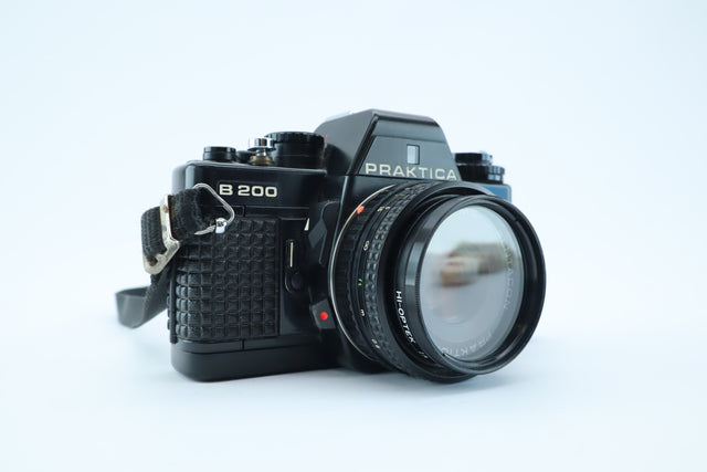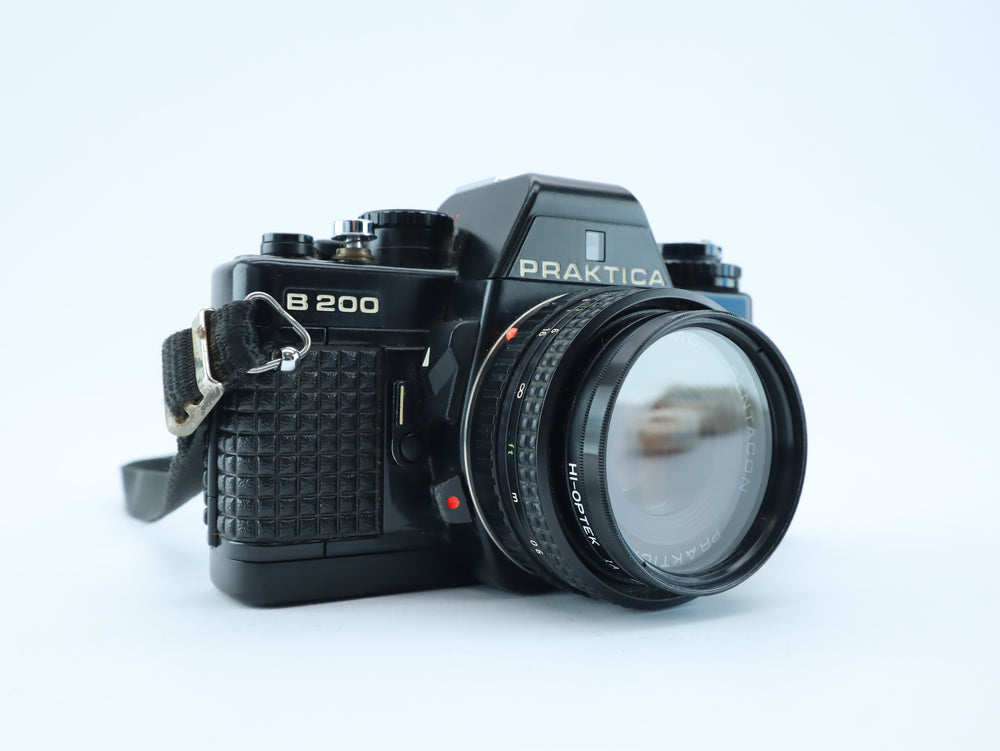 The Praktica B200 Electronic is a reliable 35mm SLR camera from the early 1980s, produced in East Germany. It features aperture-priority automatic exposure and is part of the Praktica B-series, using the Praktica bayonet (PB) mount. This set comes with the Pentacon Prakticar 50mm f/2.4 MC lens — a standard multi-coated prime lens known for its sharpness and pleasant rendering.