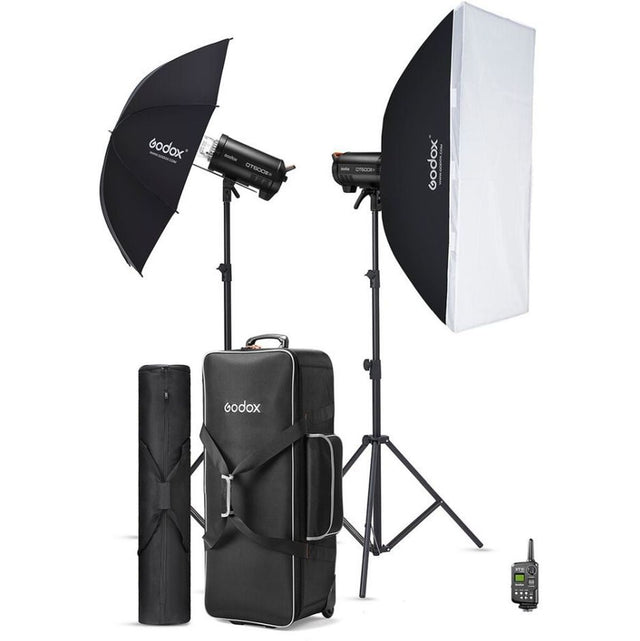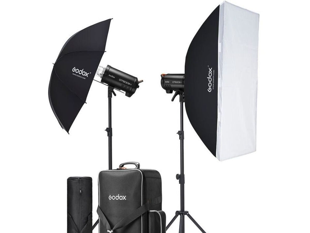 The Godox QT600IIIM-C Duo Studio Kit is a space-saving and portable light set that integrates two 600W strobe monolights into an impressively multipurpose setup. The kit comprises of an 81 x 122cm softbox, a 101.6cm black/white flash umbrella, two light stands, and a 2.4GHz wireless remote.