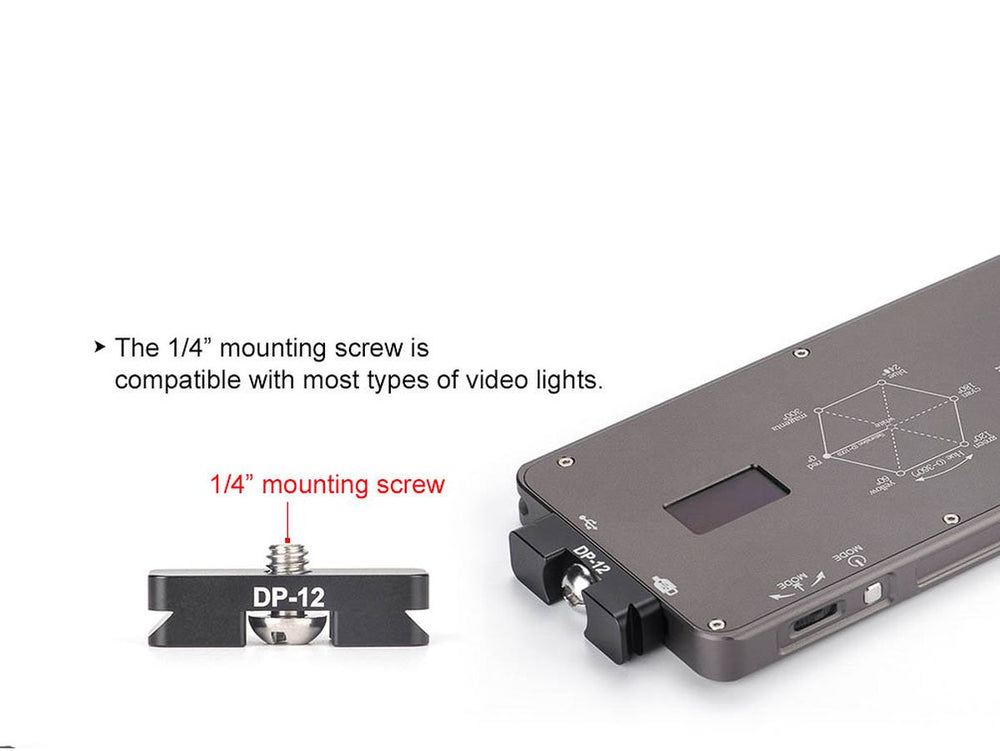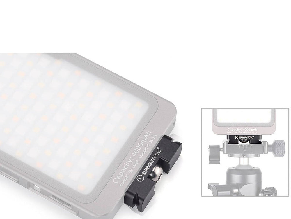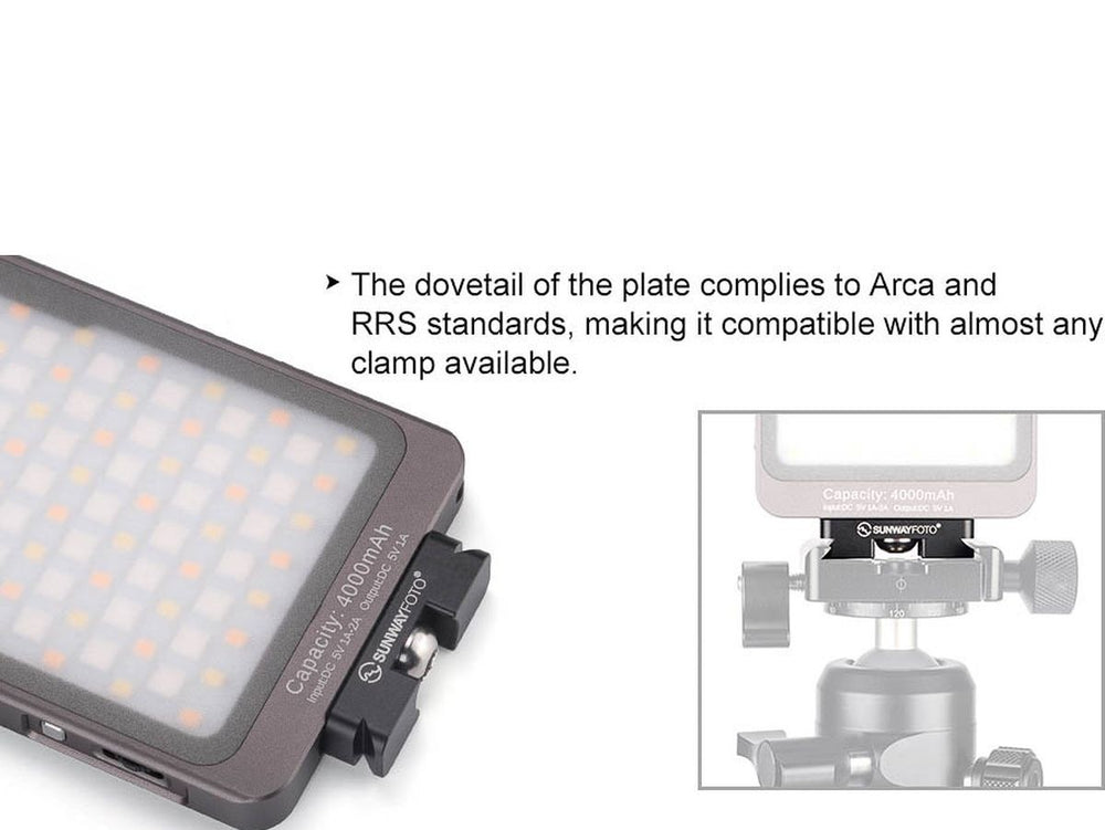 The Sunwayfoto Mini DP-12 Quick Release Plate is an efficient and compact solution designed for attaching various accessories like LED lights. It features a standard 1/4” screw thread, making it compatible with numerous LED lights, including the popular Sunwayfoto FL-70RGB model. Its Arca-swiss/RRS compatibility means it can be easily mounted on different brackets, providing versatility for photographers and videographers. The design also ensures that there's ample room to access all knobs on your tripod, enhancing user convenience.
