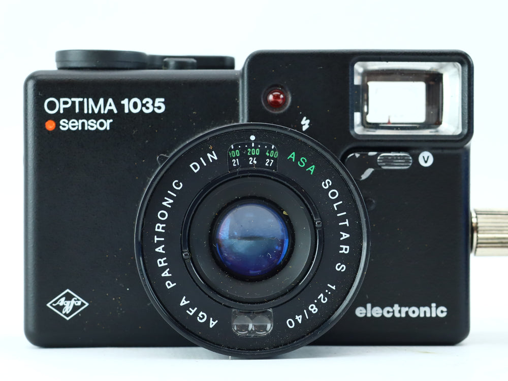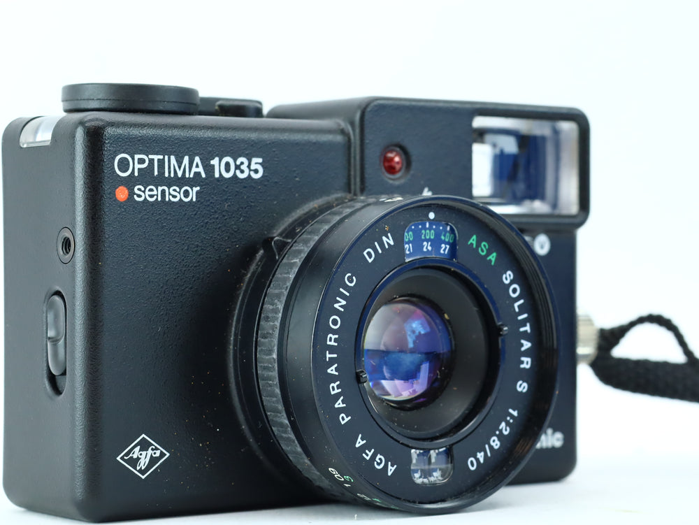 The Agfa Optima 1035 Sensor is a premium 35mm compact camera from the late 1970s, designed for ease of use and high image quality. It features a sharp and contrasty Solitar S 40mm f/2.8 lens, fully automatic exposure via Agfa’s Paratronic system, and the distinctive red Sensor shutter button. With its sleek German design and pocketable form, it's a favorite among analog photography enthusiasts.