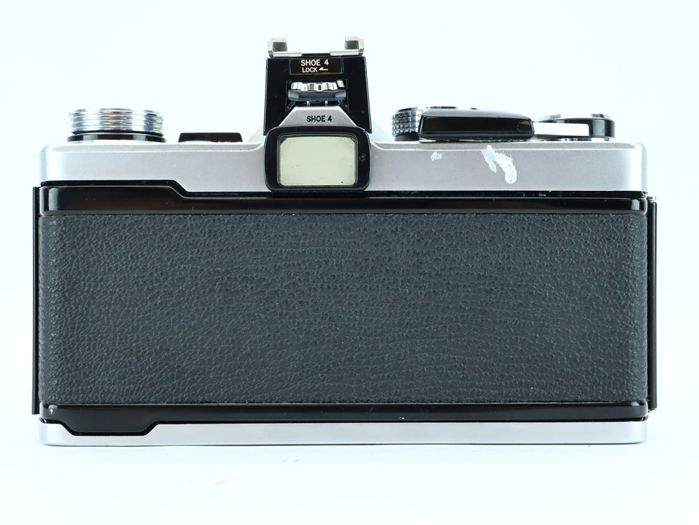 Used – Good condition. Camera and lens both show light signs of use. The lens is clean, free of haze or fungus. The viewfinder is bright and clear. Light meter has been tested and is working correctly.