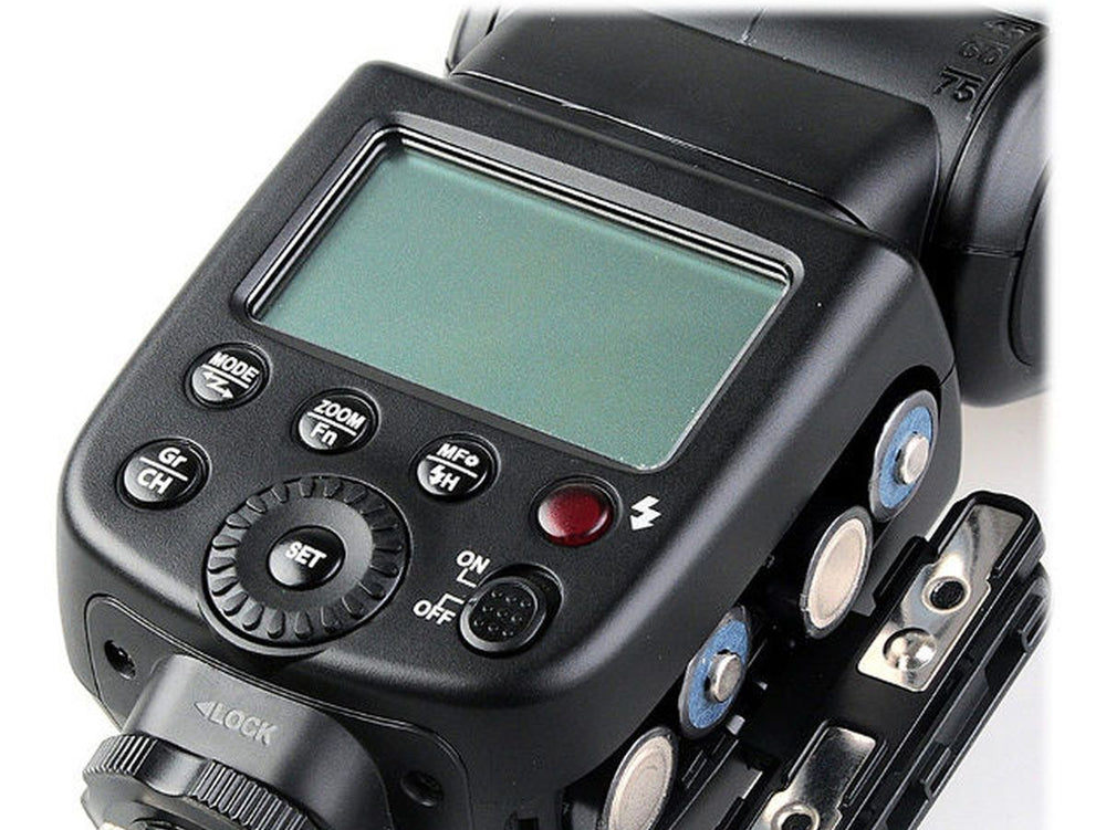 A clear, illuminated LCD display allows effortless setting viewability. External power connectivity options are provided, along with a 3.5mm sync port. You can make adjustments to the flash values using the central control dial. Featuring a sturdy metal hot-shoe attachment, the flash unit also integrates a reliable locking pin.