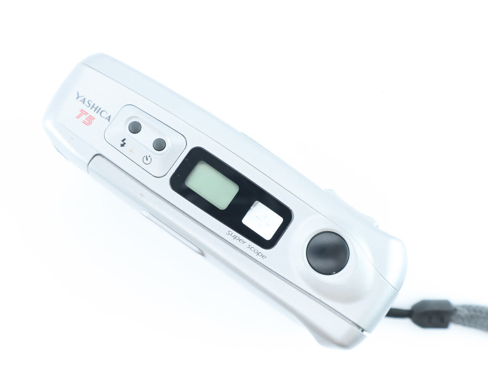 The Yashica T5 (also known in some markets as the Yashica T4 Super D) is a cult-classic 35mm compact film camera, prized for its Carl Zeiss Tessar T* 35mm f/3.5 lens and rugged, pocketable design. The camera, serial number 105005, features a weather-resistant body, autofocus, and a unique waist-level “Super Scope” viewfinder, making it a favorite among street photographers and point-and-shoot enthusiasts.