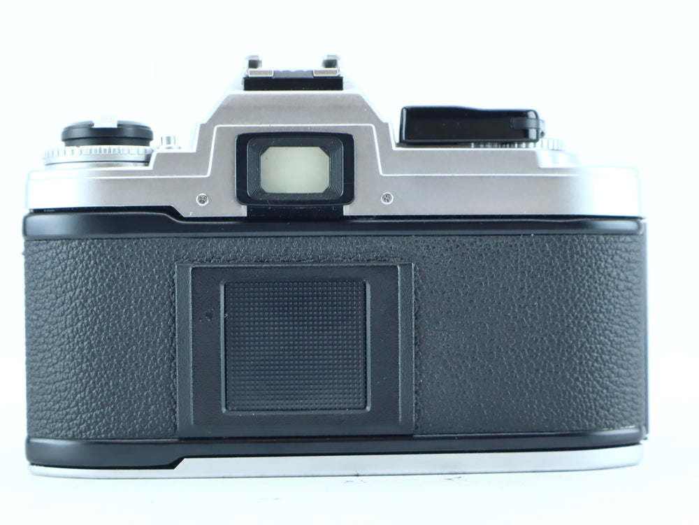 Used – Good condition. Shutter and meter tested and working. Lens optics are clear; aperture and focus rings turn smoothly. Minor cosmetic signs of use.