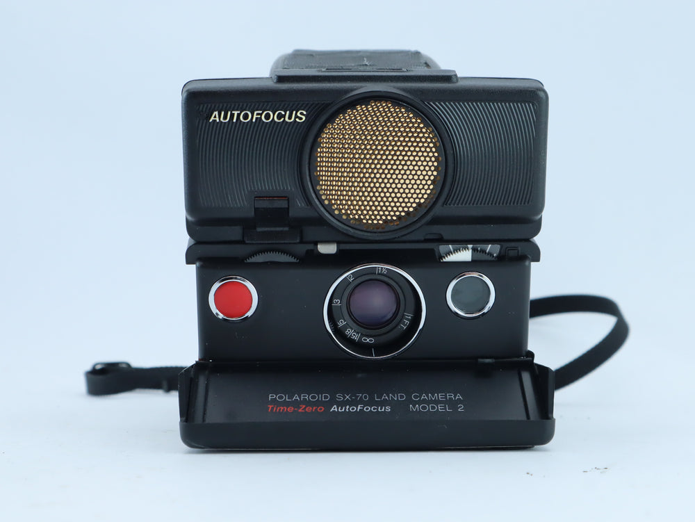 The Polaroid SX-70 Model 2 is a later version of the iconic SX-70 folding SLR camera, known for its elegant design and through-the-lens focusing. Featuring the same classic body style but finished in a durable textured plastic instead of leather, the Model 2 retains all the core functionality of the original, including a reflex viewfinder and electronic exposure control. It’s a timeless instant camera still adored for its soft, vintage image rendering.