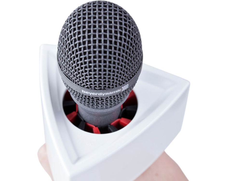This mic flag is compatible with microphones featuring diameters ranging from 19mm to 38mm. For wider microphones exceeding 32mm in diameter, the lid can be removed from the flag and the black rubber fins detached. This adjustment results in a looser fit, making it easier to mount on larger microphones.