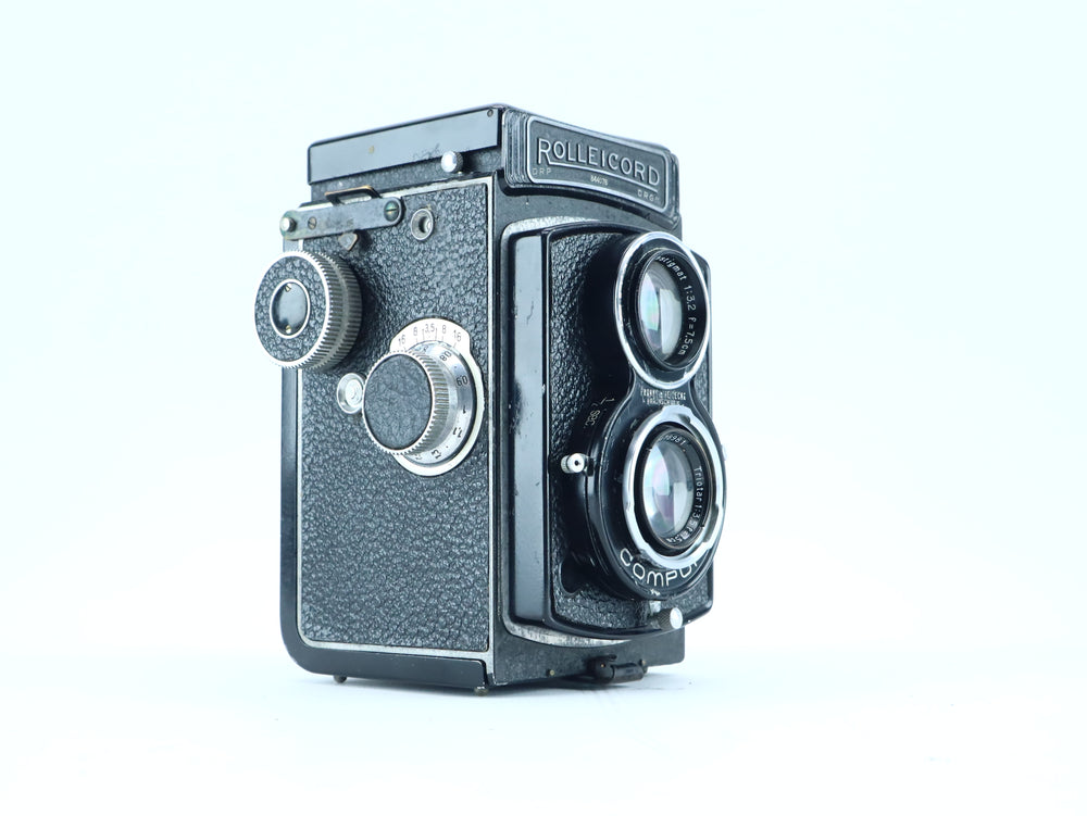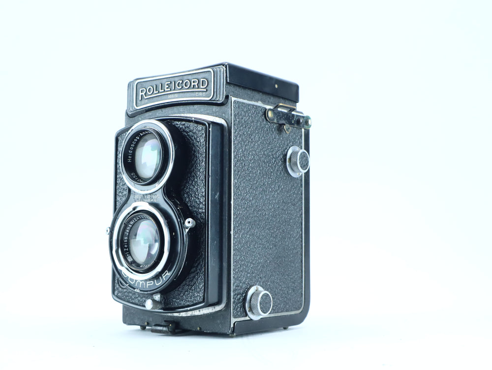 The Rolleicord DRP DRGM is an early twin-lens reflex (TLR) camera produced by Franke & Heidecke in Germany. Built with the same precision craftsmanship that defined the legendary Rolleiflex series, the Rolleicord was designed as a simpler yet highly capable alternative. This example is fitted with a Heidoscop-Anastigmat 75mm f/3.2 viewing lensand a Carl Zeiss Jena Triotar 75mm f/3.5 taking lens, a combination known for its crisp rendering and distinctive vintage character.