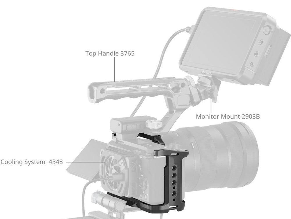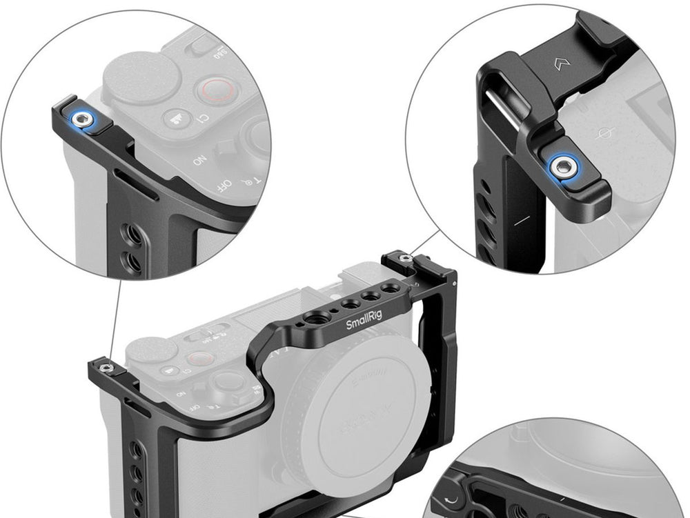 The cage provides numerous accessory attachment points, including 1/4"-20 threaded holes, ARRI locating holes for above (SmallRig ID 4757) and side (SmallRig ID 4755) grips, a cold shoe mount for microphones, lights and other accessories, and strap holes on the sides and bottom for the wrist strap (SmallRig ID 3848) and shoulder strap (SmallRig ID PSC2428).