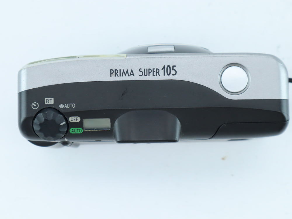 The camera features autofocus, automatic exposure, a built-in flash with red-eye reduction, and a clear real-image viewfinder. With its sleek design and lightweight build, the Prima Super 105 is ideal for everyday photography.