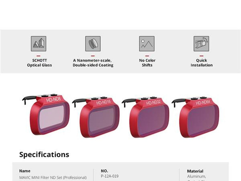 - Comprises four distinct ND filters (ND8, ND16, ND32, ND64)
