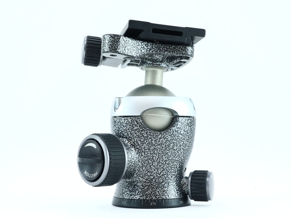 The ball head shows light signs of use. Movement is smooth, all knobs function properly, and the locking mechanism holds firmly. The quick release clamp operates as intended. Ideal for photographers using long lenses or medium/large format cameras.