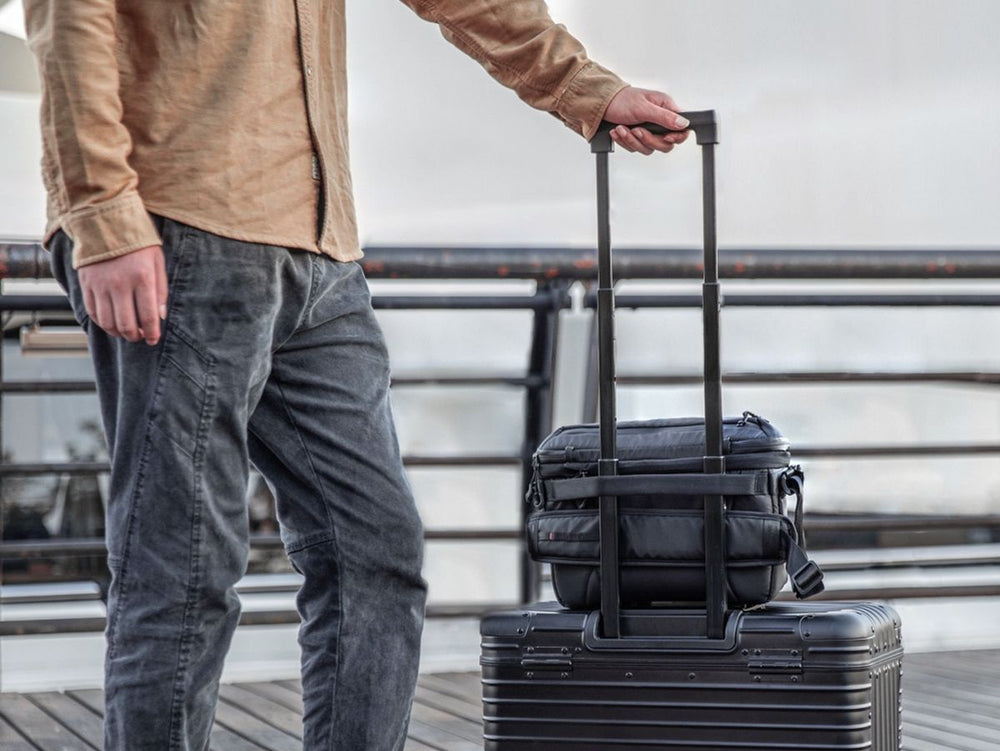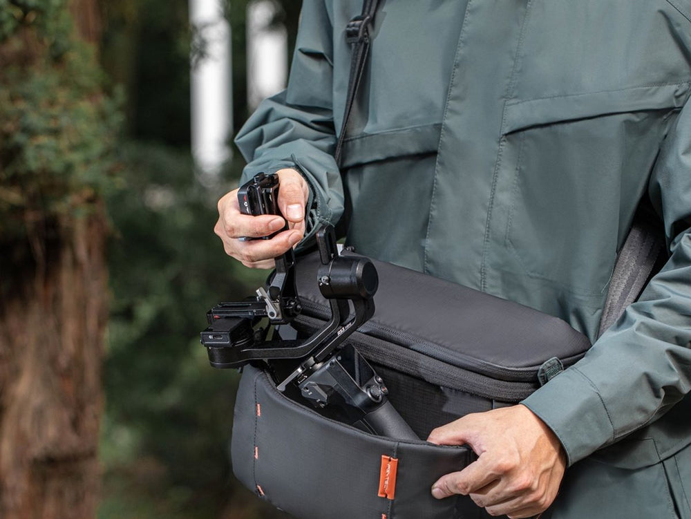 The main pouch of the PGYTech OneMo Sling can accommodate cameras, drones and iPads. The centrally located adjustable sleeve is ideal for stabilizers or large objects. The front pocket can hold small essentials, with room for a 500 ml water bottle. There's even a discreet inner pocket where you can conceal your AirTag for added security against loss or theft.