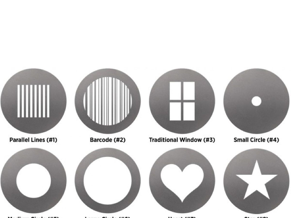 - Gobo Designs: Eight, including Small Circle, Medium Circle, Large Circle, Heart, Star, Traditional Window, Parallel Lines, Barcode