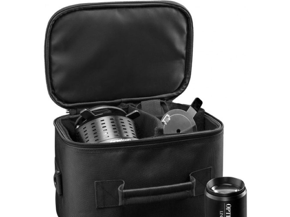 The package includes the Optical Spot body, an Optical Spot light mount (FJ400, Bowens, Godox), a lens with Cap (150mm f/3,5), a lens case, a pack of 8 gobos, a gobo holder, a gobo storage case, a pack of 5 gels, a lens cap, and a travel case.