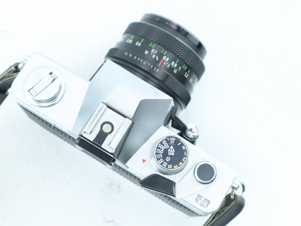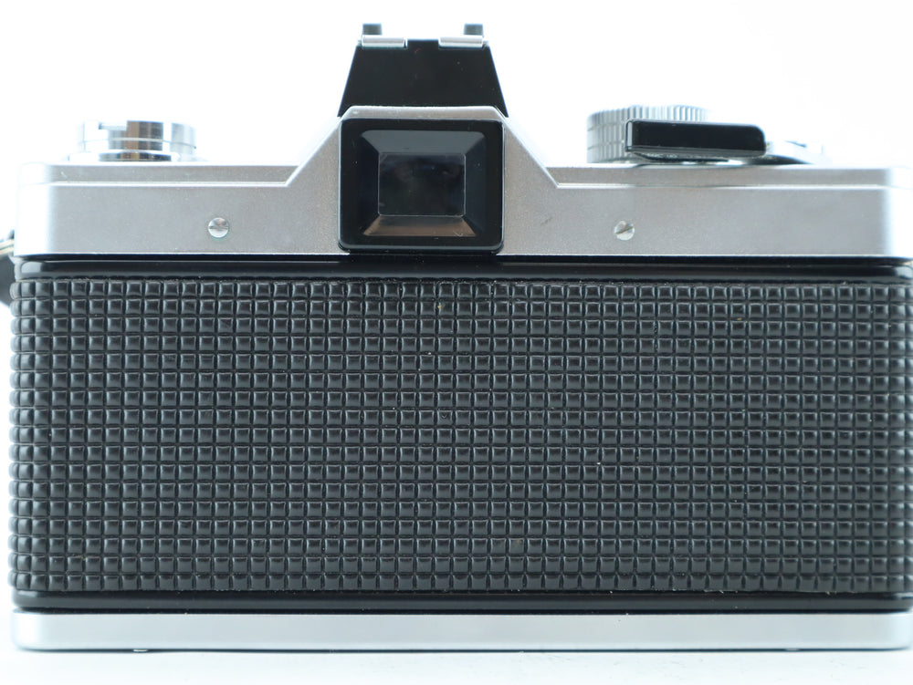 Camera is in good working order. Shutter fires accurately at all speeds, meter is responsive (battery required), and film advance operates smoothly. Lens optics are clean with no haze or fungus, and focus and aperture rings turn smoothly. Cosmetically, the set shows light signs of use but is overall well cared for and fully functional.