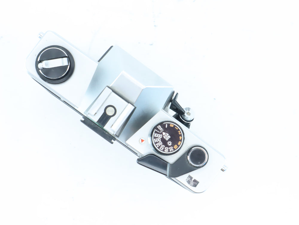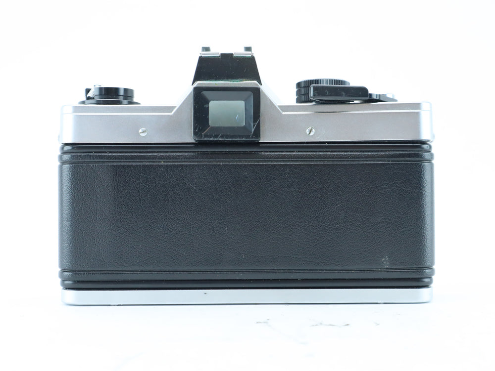 Camera shows normal signs of age and use. Shutter, film advance, and meter tested and functioning. Viewfinder is clear with minimal dust. A solid and fully mechanical SLR body.