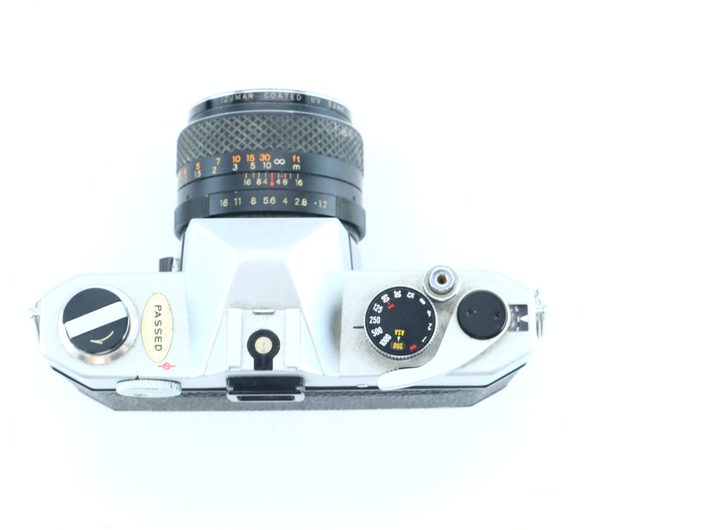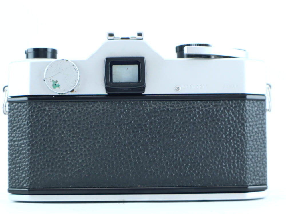 Used – Good condition. Light cosmetic wear. The camera has been tested: shutter speeds sound accurate, film advance is smooth, and the light meter responds. The included lens is clean, with smooth focusing and snappy aperture blades.