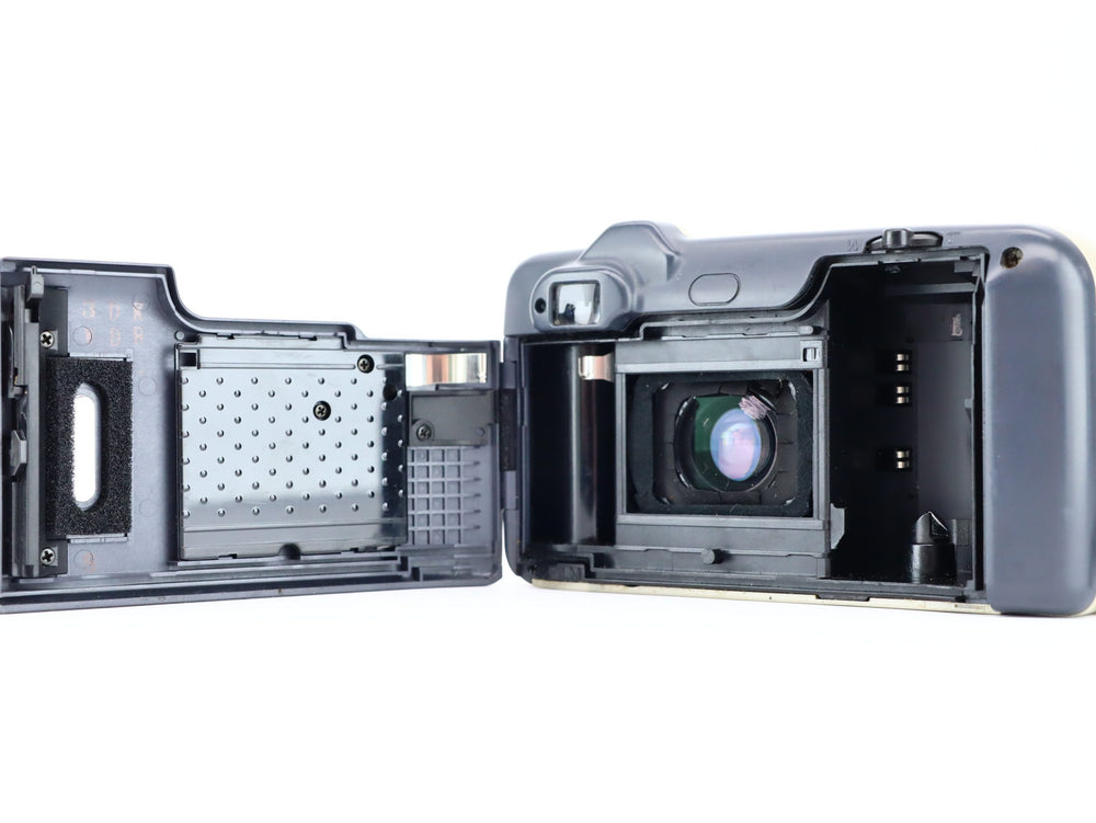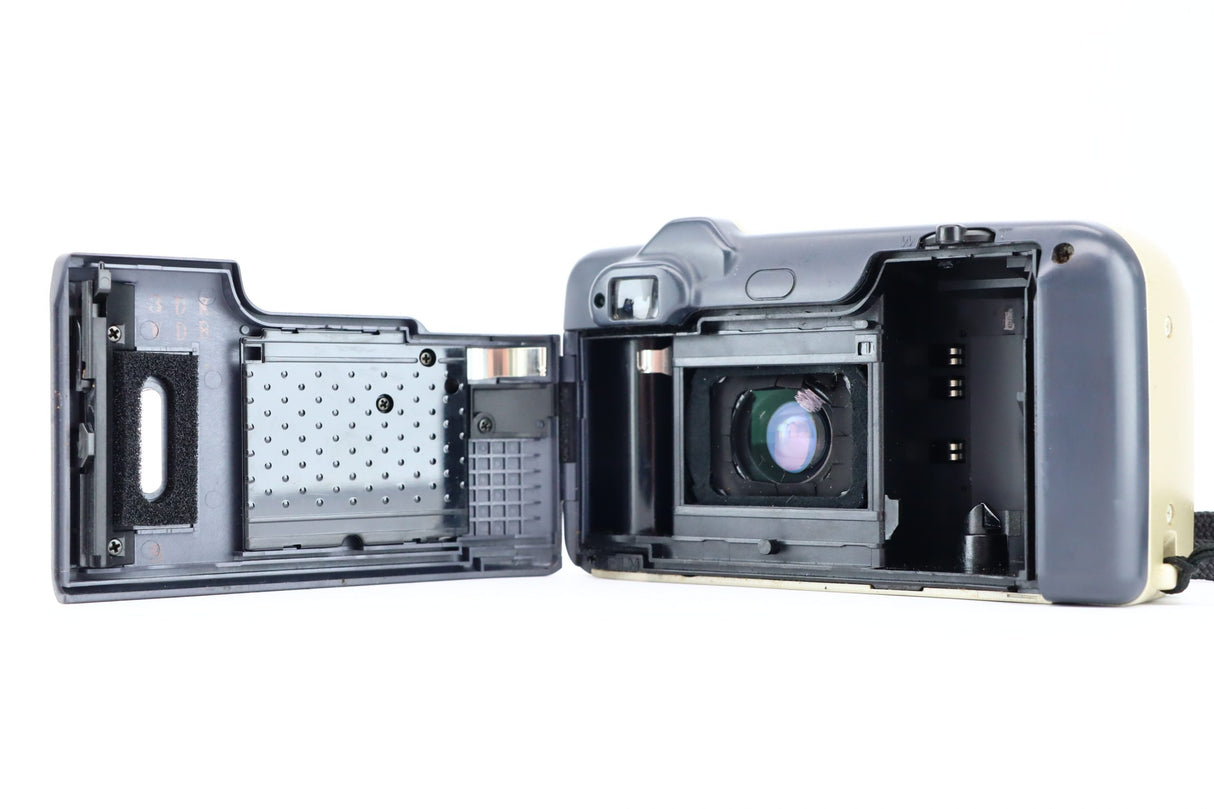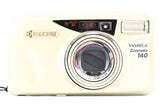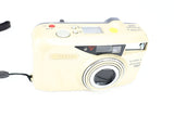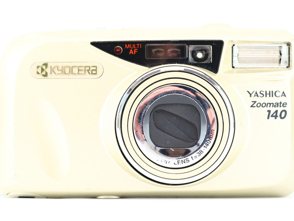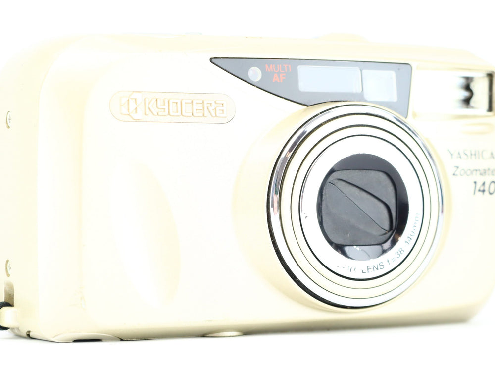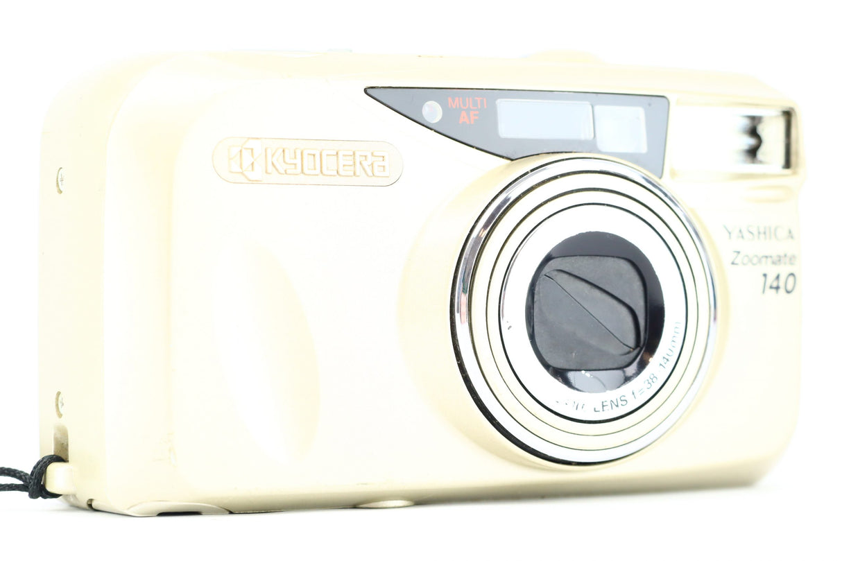This compact and lightweight point & shoot for 35mm film was introduced in 1998 (after Yashica had rebranded itself as Kyocera). As one of their Zoomate models, it offers a 10-element, 9-group lens zoomable between 38 and 140mm in focal length. Sacrificed to maintain compactness is the lens speed: f/6.2 at the wide setting, and f/11.7 at full telephoto. Thus use of the built-in electronic flash becomes mandatory in many situations.