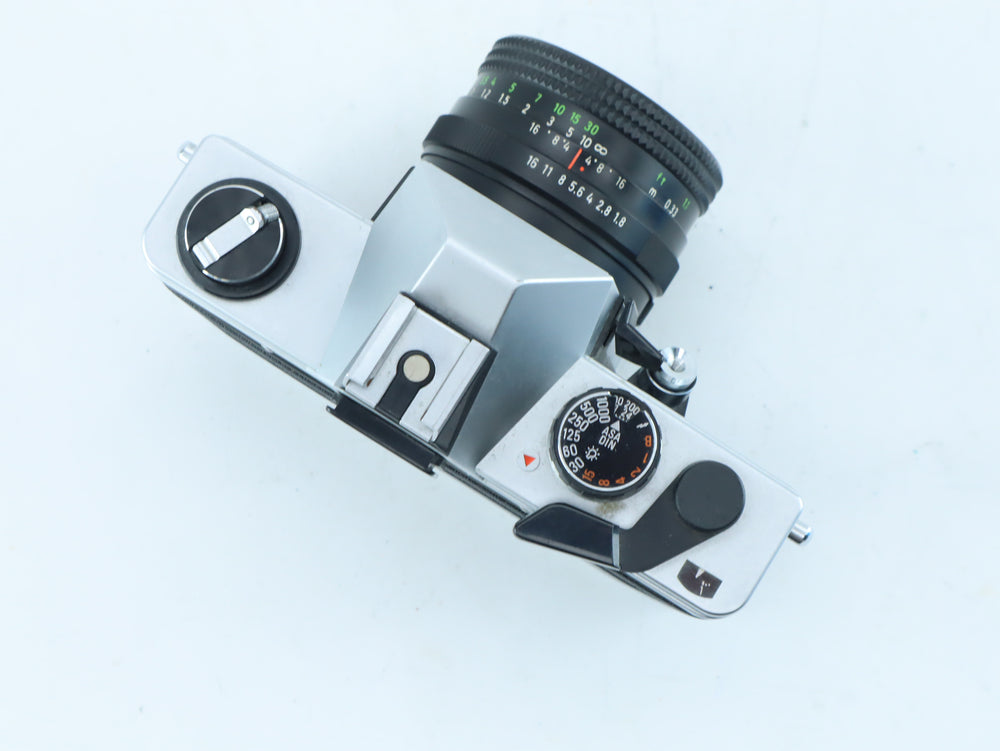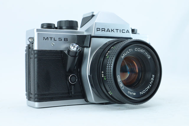 The Praktica MTL 5 B is a classic East German SLR, building on the success of the MTL series with refined ergonomics and a reliable mechanical design. It features the versatile M42 screw mount, allowing compatibility with a vast range of vintage glass. This model is paired with the Multi Coating (MC) Auto 50mm f/1.8 lens, famous for its excellent color reproduction and sharpness. With its vertical-travel metal shutter and straightforward TTL metering, the MTL 5 B provides a tactile and dependable shooting experience for those who appreciate traditional mechanical engineering.