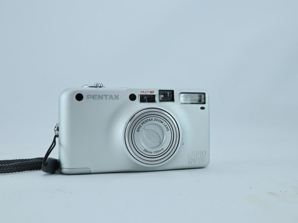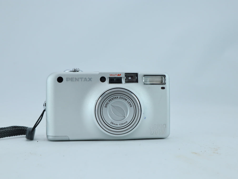 The Pentax Espio 120SW is a compact 35mm film camera known for its wide-angle zoom lens and reliable fully automatic operation. This example comes with serial number 5529909 and is a popular choice for travel and everyday film photography, offering ease of use combined with classic Pentax optical quality.