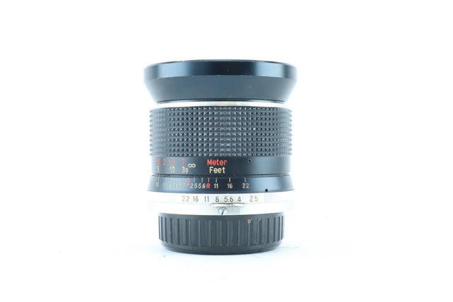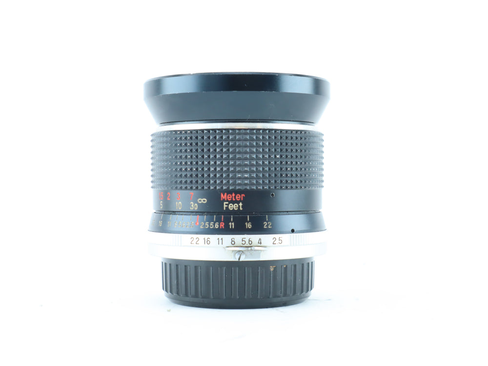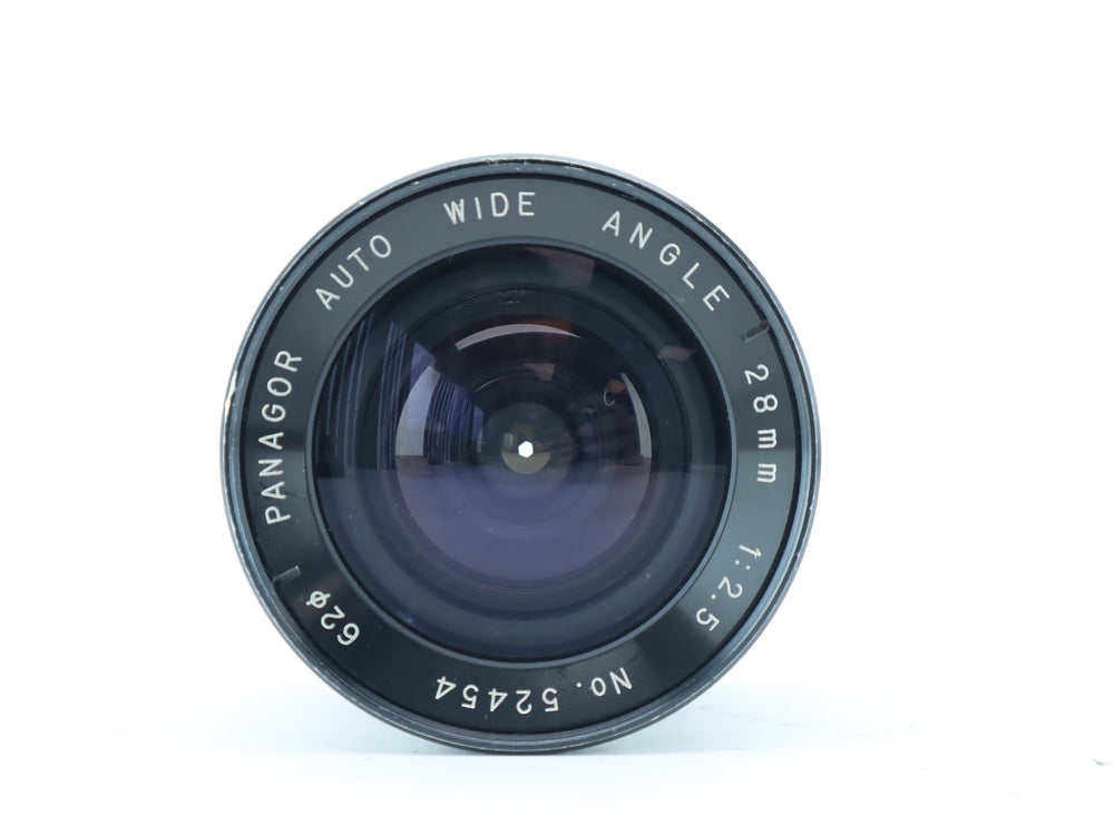 The Panagor Auto Wide Angle 28mm f/2.4 is a fast and well-built manual focus lens, known for its solid metal construction and smooth operation. The bright f/2.4 maximum aperture makes it well-suited for available light photography, while the 28mm focal length offers a natural wide-angle perspective ideal for landscapes, street scenes, and travel.