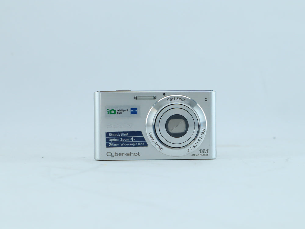 This Sony Cyber-shot digital compact camera features a 14.1 megapixel sensor and a Carl Zeiss Vario-Tessar 18–47mm f/2.7–5.7 zoom lens. This example comes with serial number 4588572 and offers easy operation combined with trusted Sony build quality and Zeiss optics, making it suitable for everyday photography and travel.