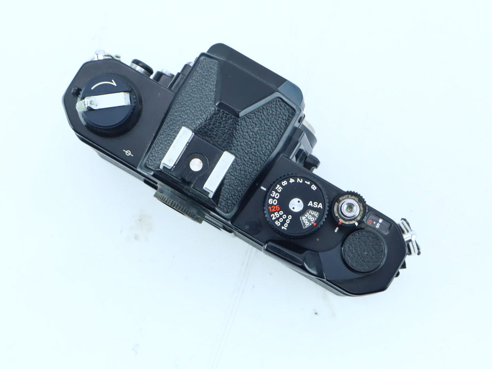 Condition Report Good condition. The camera body (S/N: 2338748) shows normal signs of light use and minor cosmetic surface wear consistent with its vintage age. The mechanical shutter has been tested and is firing accurately across all speeds. The film transport mechanism is smooth, and the advance lever is crisp. The light meter is responsive, and the battery compartment is clean and free of corrosion. The viewfinder is clear and the mirror dampener is in good condition.