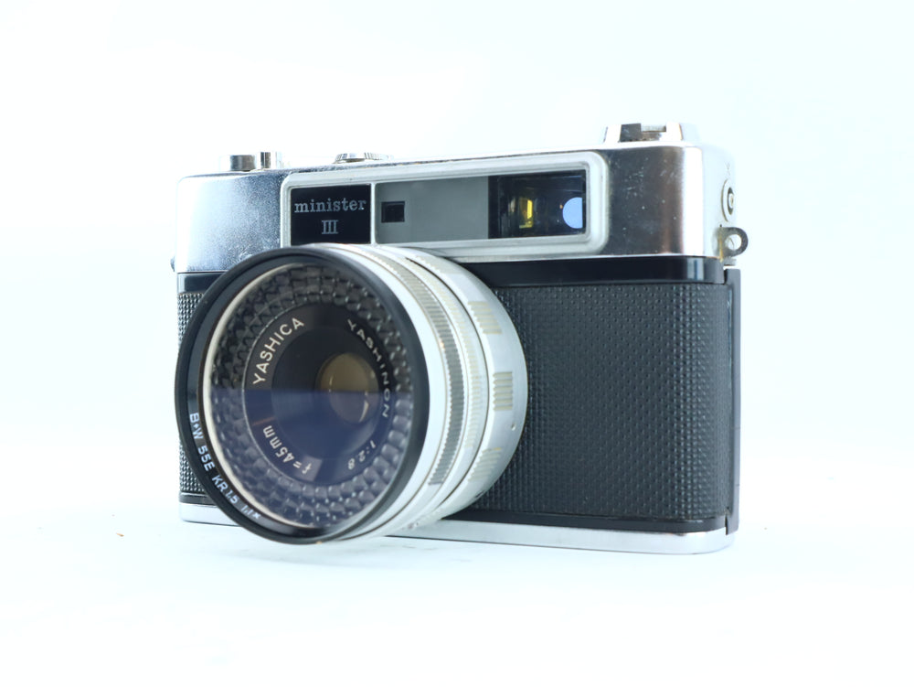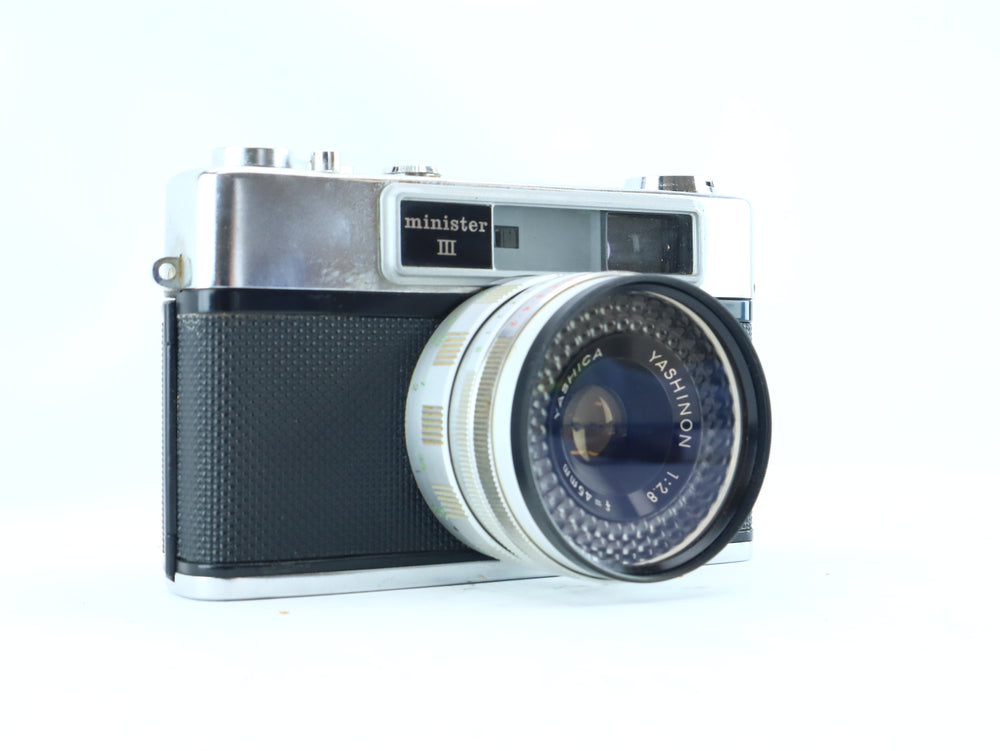 The Yashica Minister III (serial no. H 819985) is a well-built 35mm rangefinder camera from the mid-1960s, featuring a bright Yashinon 45mm f/2.8 lens and a reliable coupled rangefinder focusing system.