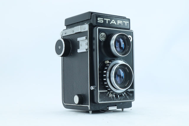 The Start 66 is a robust and historically significant Twin-Lens Reflex camera manufactured by WZFO in Poland. It represents a key piece of Eastern European photographic history, known for its solid construction and reliable performance. This specific unit features an Emitar 3.5 75 viewing lens, serial number 19366, and an Emitar 3.5 75 taking lens, serial number 19899. It produces 6x6 exposures on 120 roll film and is a distinctive choice for photographers and collectors interested in the heritage of European optics.