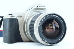 The Canon EOS 300 (also known as the Rebel 2000) is a lightweight and easy-to-use 35mm autofocus SLR ideal for beginners and enthusiasts who want reliable performance in a compact body. Paired with the Canon EF 28–90mm f/4–5.6 zoom lens, this setup covers a versatile range from wide-angle to short telephoto—perfect for travel, portraits, and everyday film photography.