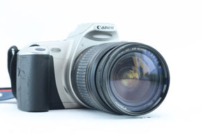 The Canon EOS 300 (also known as the Rebel 2000 in North America) is a compact and user-friendly 35mm autofocus SLR, perfect for both beginners and advanced enthusiasts. It features full automatic modes, advanced manual settings, and a bright optical viewfinder. Paired with the versatile Canon EF 28–80mm f/3.5–5.6 zoom lens, this kit is well-suited for general photography—from wide landscapes to short telephoto portraits.