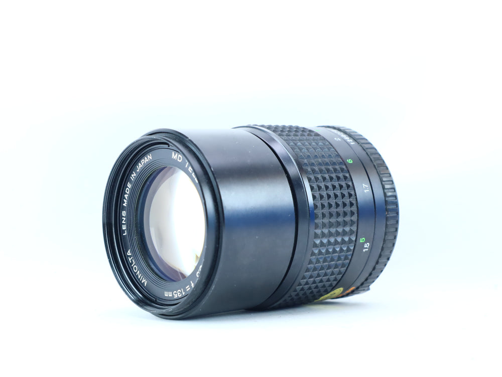 The Minolta MD Tele Rokkor 135mm f/3.5 is a highly regarded telephoto prime lens, celebrated for its superb optical performance and remarkably compact form factor. As part of the prestigious Rokkor lineup, this lens delivers the rich color saturation and smooth, circular bokeh that Minolta glass is famous for. The 135mm focal length provides excellent reach and pleasing perspective compression, making it a favorite for outdoor portraiture, sports, and detail-oriented street photography. With its lightweight design and built-in retractable lens hood, it offers professional handling without the bulk of faster telephoto lenses, ensuring it remains a practical and high-performing choice for any MD-mount system.
