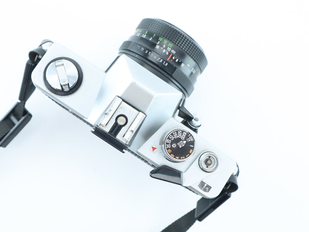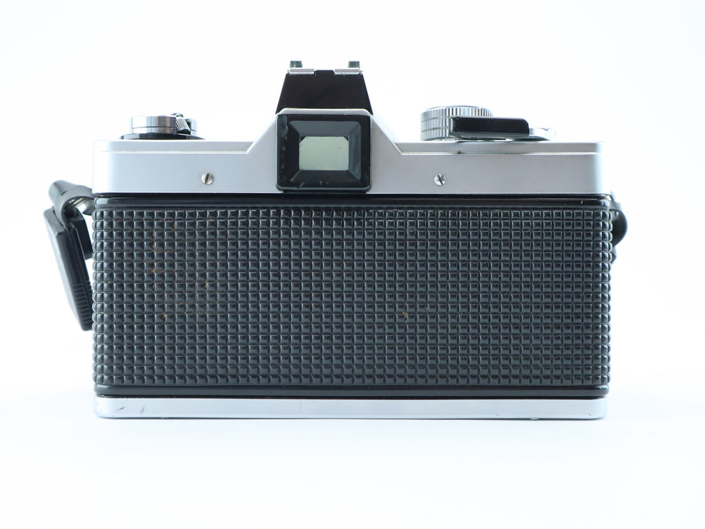 Camera body (SN: 1275456) is volledig functioneel. Sluiter werkt nauwkeurig en filmtransport is soepel. Lichtmeter reageert correct (batterij niet inbegrepen). Lens is schoon - geen waas of schimmel.De focus- en diafragmaringen draaien soepel. Lichte cosmetische slijtage door normaal gebruik.