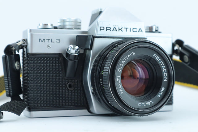 De Praktica MTL 3 is een betrouwbare 35mm SLR camera geproduceerd door Pentacon in voormalig Oost-Duitsland. Gebouwd met een duurzame metalen behuizing en een mechanische sluiter, beschikt het over door-de-lens (TTL) match-naald belichtingsmeting, een helder split-image scherpstelscherm, en volledige handmatige bediening - perfect voor iedereen die geniet van de hands-on ervaring van analoge fotografie.